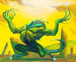 Zu'lit csak a fejt rzta szomoran, de aztn ttva maradt a szja, s elremutatott. A stt sereg hts soraibl valami hatalmas mret mozgott elre. Egy fekete figura, t-hat mter magasan, risknt magasodott a tmeg fel, kt hihetetlenl hossz karmokban vgzd karja hallos kaszaknt nyitott magnak utat. Amerre jrt, fekete kd telepedett mindenre. Azok a katonk, akiket megrintett, rongybabkknt rogytak ssze, de az lholtakra lthatlag nem volt hatssal.